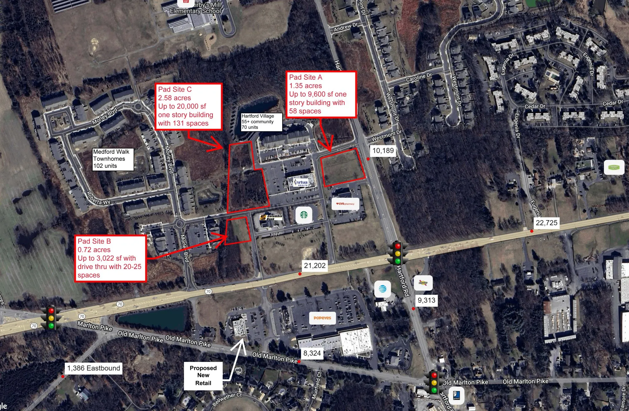 Pad B – 0.72 acres, up to 3,022 SF building with drive-thru and 20–25 parking spaces